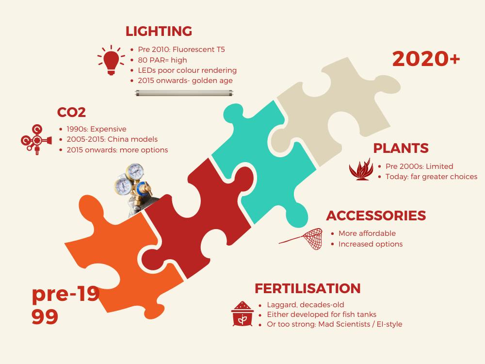 Nuestra historia es sencilla. Los últimos 20 años han sido una época dorada de transformación para la acuariofilia plantada. Los elementos fundamentales -el CO2 y la iluminación- se han abaratado y mejorado radicalmente gracias a la producción en masa. Las variedades de plantas se han subido a la ola de la globalización para proliferar como nunca antes: plantas nuevas, más coloridas y con necesidades más complejas. Los accesorios de acuario (filtros, bombas, herramientas) han aumentado en variedad y sofisticación.