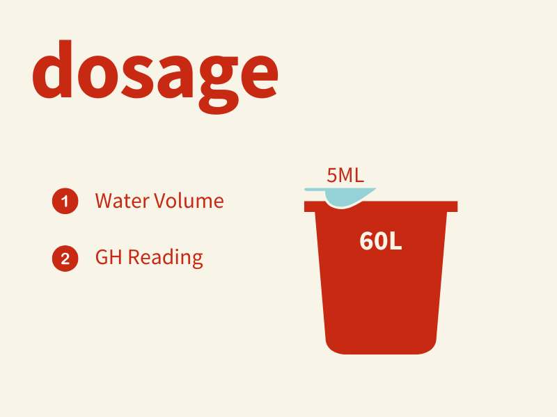 Use the Dosage Calculator (below) to determine dosage. For the very first dose, Water Volume = tank's water volume. GH Reading is your tank's GH level.